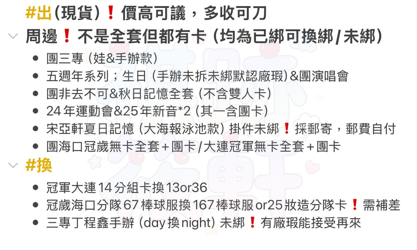 團款: 三專、五週年生日&演唱會 、團冠歲海口&冠軍大連、秋日記憶、24年運動會&25年新音等等 ⚠️以上非全套但都有卡 單人: 宋亞軒夏日記憶、賀峻霖25年生日、其他單人小物(具體看圖) ⚠️所有卡況均為已綁可換綁/未綁 需看對光請自行私訊,所有周邊&小卡默認廠損,完美主義者慎入