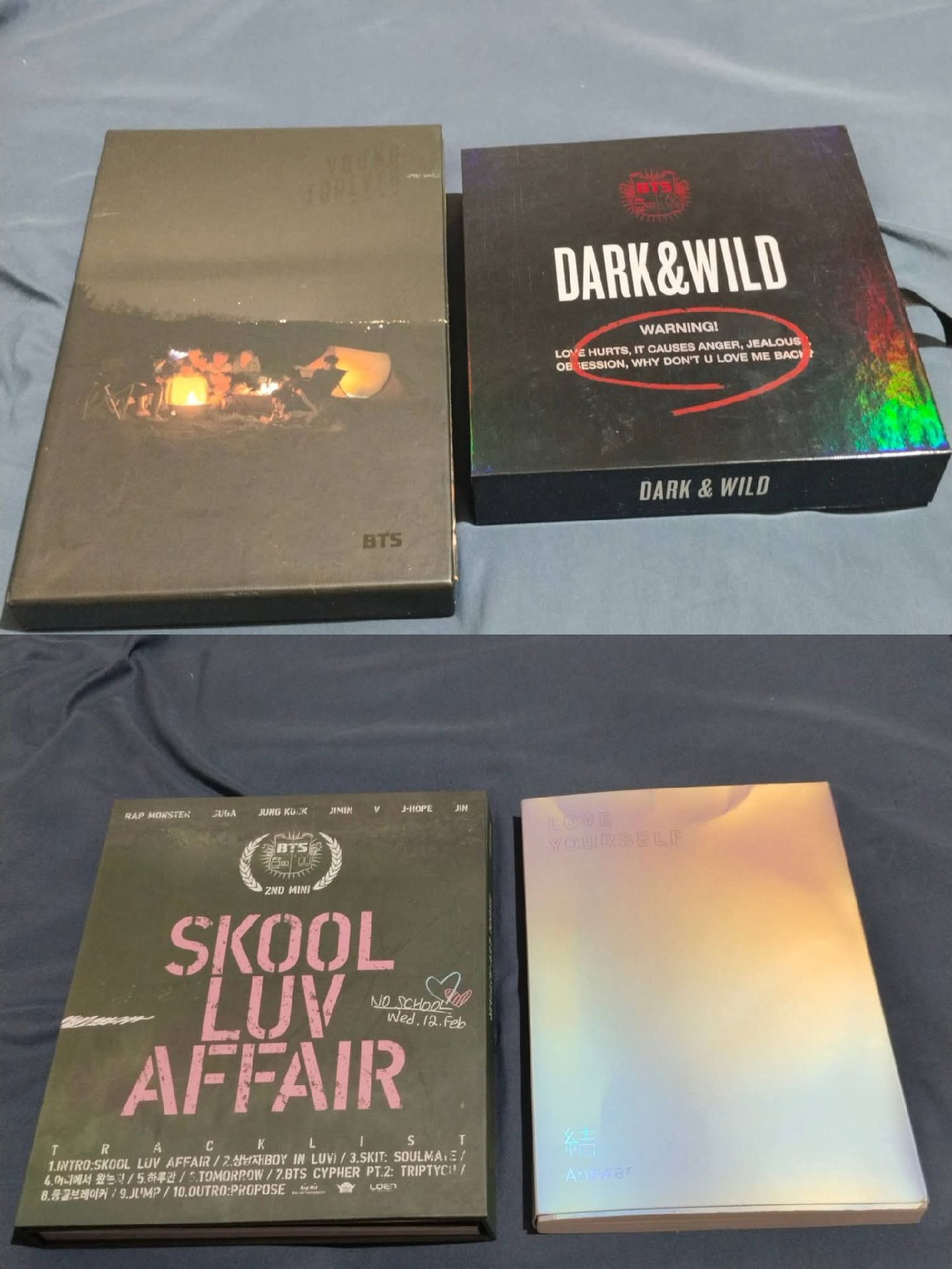默認廠損❗ -Young forever 黑版有小卡旻 -Loveyourself 有貼紙*外殼有壓到的痕跡 邊角也有一點損 -Dark & Wild -Skool Luv Affair 有泰亨書籤 -sowoozoo 數位版 QR卡已掃 卡片上有划痕